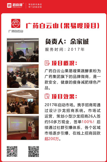 利用组合招商模式:“健康公益之旅、明星签约代言、精英代理扶持计划”以及小型沙龙招商活动,快速倍增代理